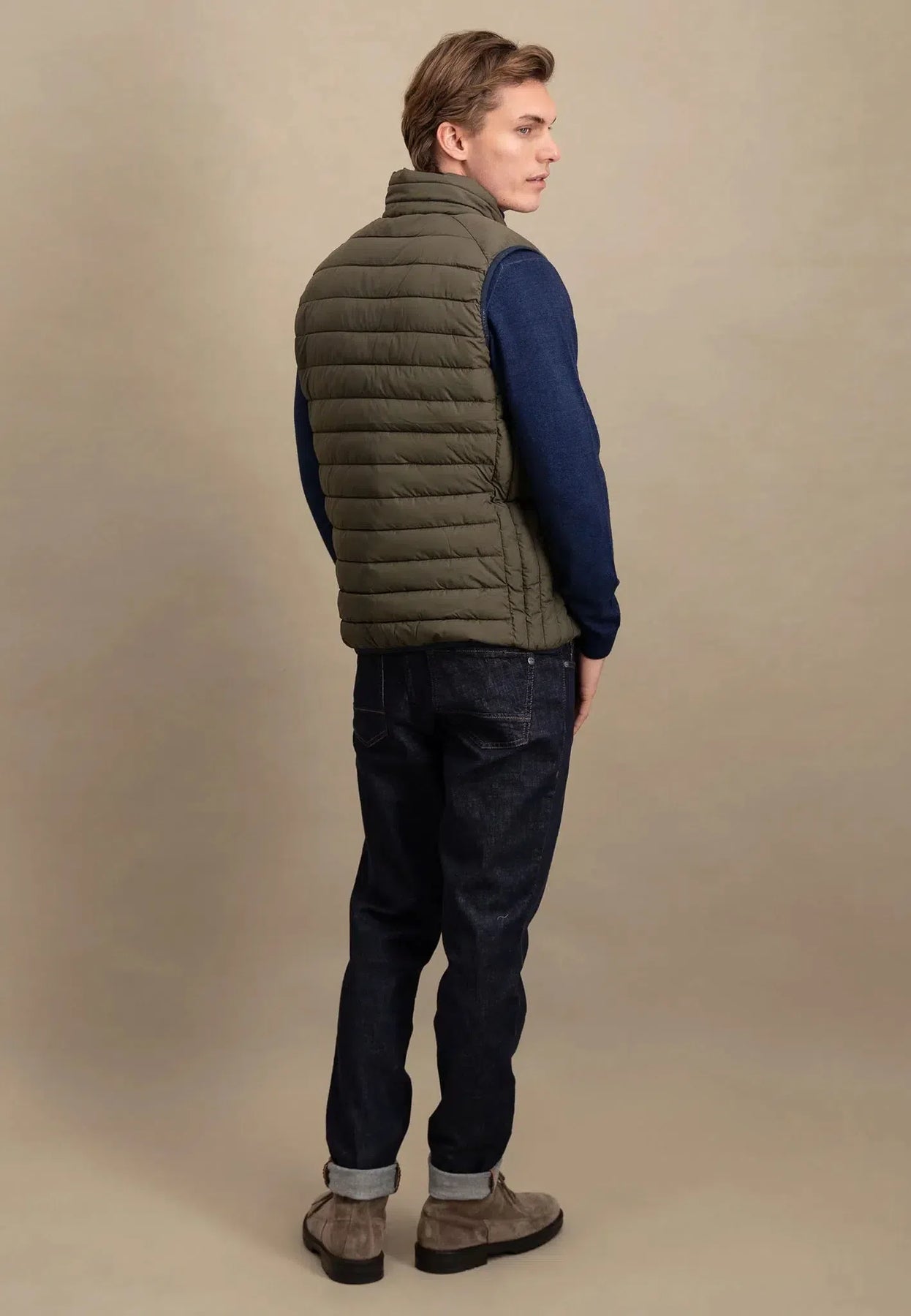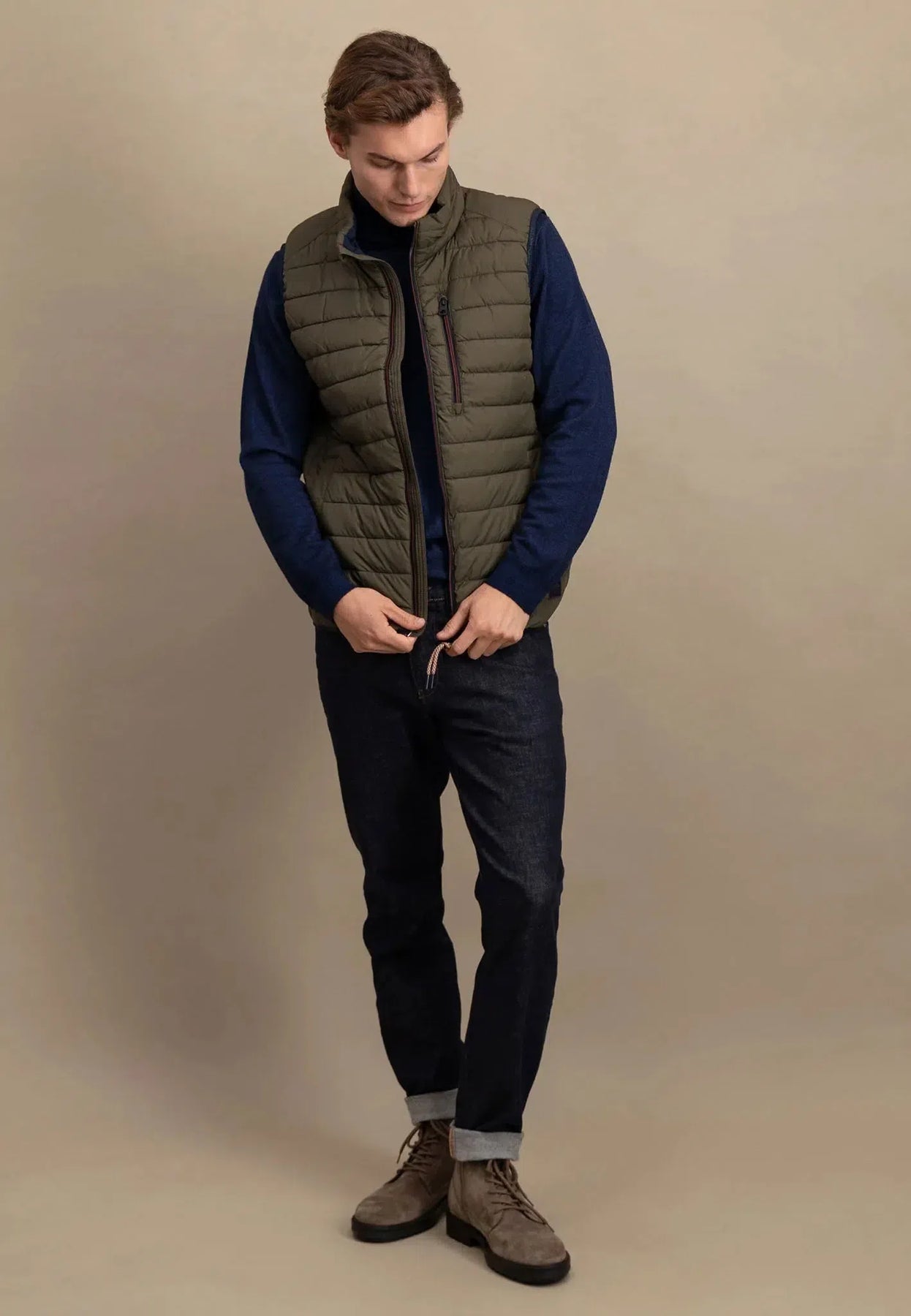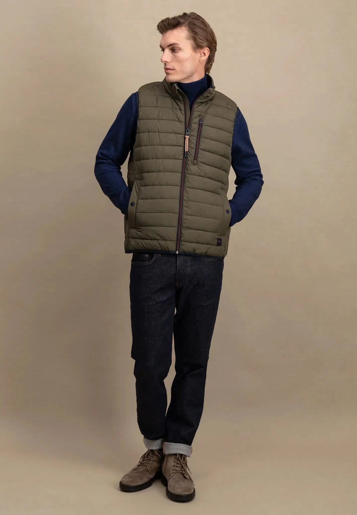 This classic light weight gilet is a perfect transitional piece for you wardrobe. Wear it over a sweater or blouse for a casual look or combine it with a long-sleeved shirt for extra warmth and style. It is finished with a contrast zip and zipped crest pocket (not shown in the image) and Fynch-Hatton branding in the bottom corner.