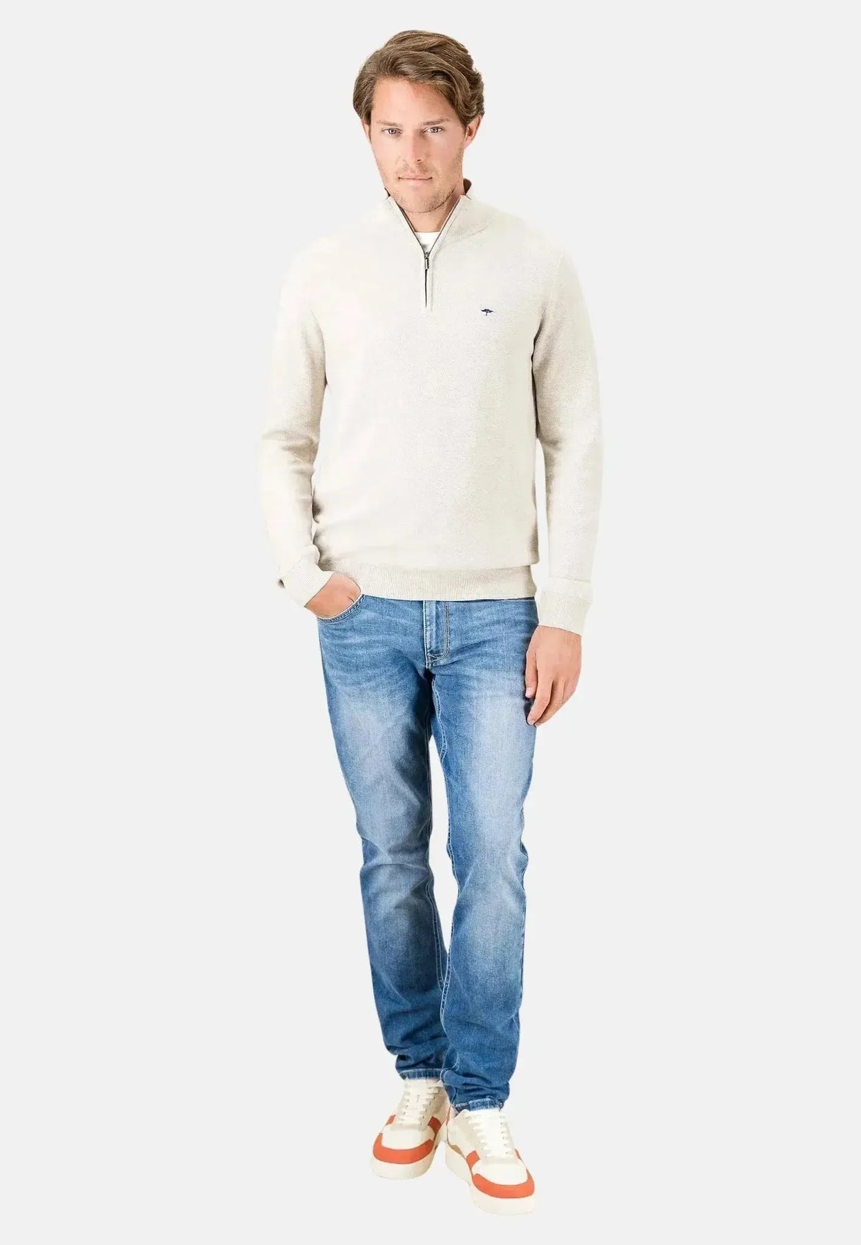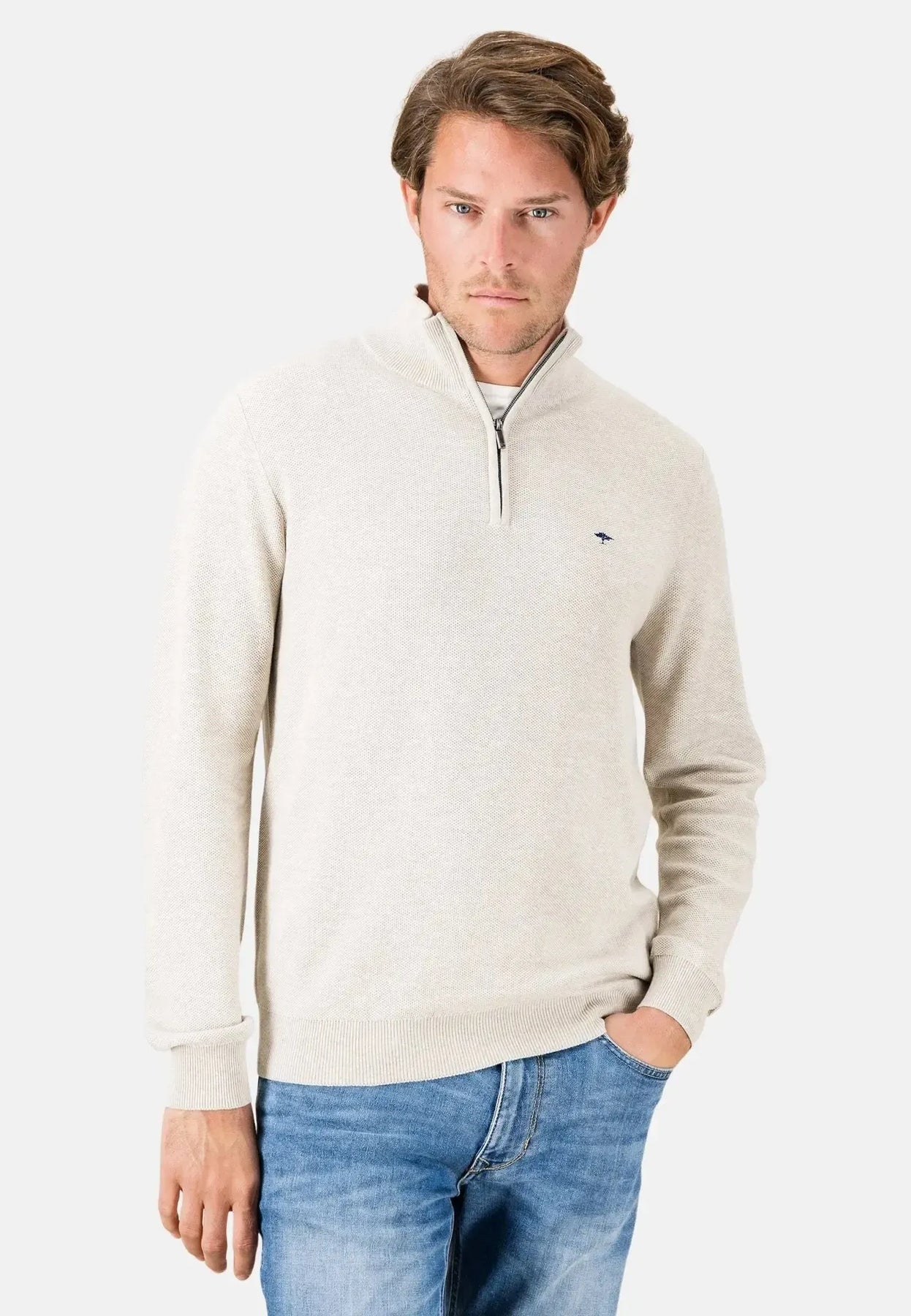 Discover our cotton 1/4 zip knit with a stand collar - the perfect piece for every occasion. Combining classic style with modern accents, this pullover creates an elegant yet relaxed look. The stand collar gives the 1/4 zip knit a sophisticated touch, while the high-quality cotton ensures ultimate comfort. Ideal for cool days, this pullover goes well with both jeans and chinos and offers endless combination possibilities.