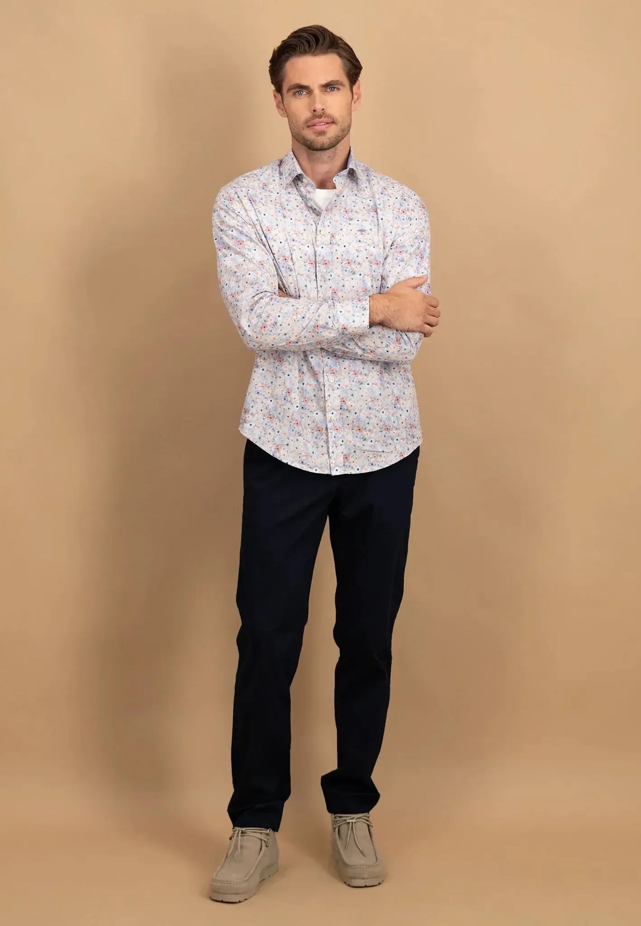 A real statement for your look – vibrant, stylish and with maximum comfort. This 100% cotton shirt, with its colorful all-over floral print, brings a summery freshness to your wardrobe. The classic Kent collar, full-length button placket, and comfortable fabric quality make it the ideal companion for days when you want to show your color. Whether paired with jeans or chinos, this shirt adds personality and a touch of casual style with a fashionable edge.
