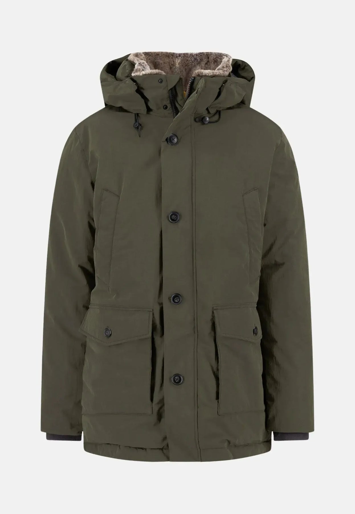 Experience the unparalleled comfort of this four-button hooded parka, featuring a soft, warm lining and logo details on the inside. The hood protects you from wind and weather, while the generously sized patch pockets offer plenty of room for your essentials. The distinctive buttons not only add a visual touch but also ensure a secure closure and additional protection from the cold.